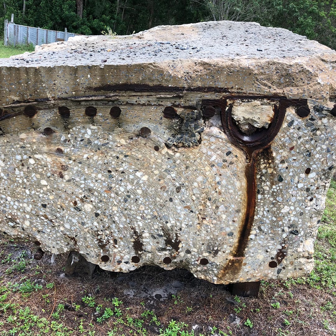 This is the longest size wise and one of the biggest blocks in the collection. All the rebar seems to be inside the concrete and it has cleanly cut lines. It would be a nice memorial to keep in its entire shape or it is big enough for San the artist to cut it into a specific sculpture shape for you.