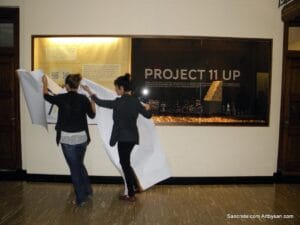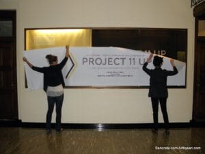 Once the MU was chosen as the resting place for Socratic Way, a glass enclosure was designed by several art students from the university’s graduate program. It included a large New York City silhouette imposed onto enlarged photos of the actual concrete and stone sculpture, giving a dramatic effect to the viewer. Socratic Way was then set upon a pedestal in the foreground.